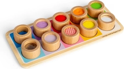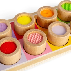 Ova čudesna senzorna ploča savršen je način kako djecu upoznati s različitim teksturama i bojama. Sadrži drvenu ploču s raznobojnim otvorima i jedanaest umetaka, od kojih svaki ima jedinstvenu površinsku obradu, od rebrastog silikona do mekog filca. Ova igračka ne samo da pomaže u razlikovanju različitih tekstura, već i potiče koordinaciju ruku i očiju.