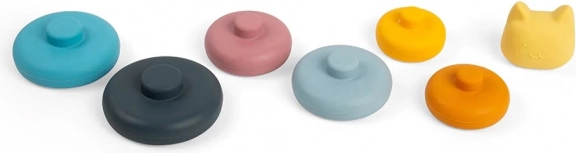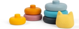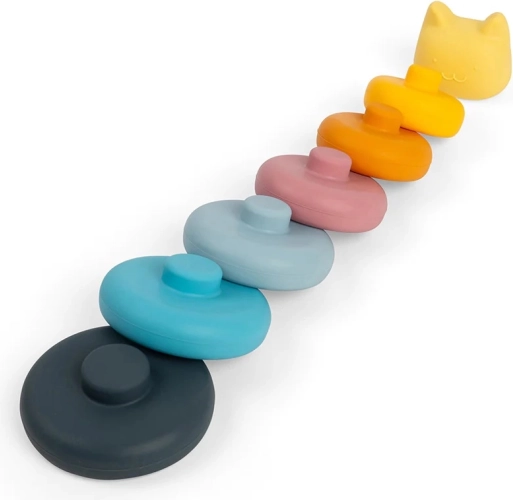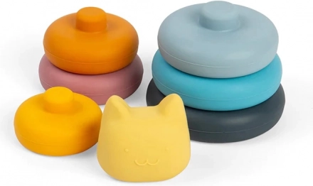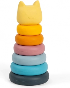 Igračka se sastoji od šest nježno obojenih prstenova i glave mačke na vrhu. Glatki silikon je ugodan na dodir te istovremeno potiče senzorički razvoj djece. Sklapajuće igračke pomažu razvijati finu motoriku i učiti boje.