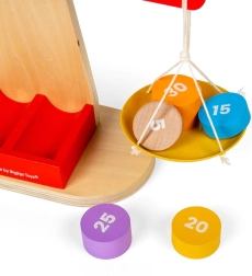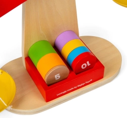 Opremljena drvenim okvirom, dvjema balansnim zdjelicama i setom od sedam utega s brojevima, vaga omogućuje djeci eksperimentiranje s različitim kombinacijama i učenje o ravnoteži. Cilj je postići uravnoteženo stanje dodavanjem ili oduzimanjem utega. Idealno za STEM učenje, koje uključuje kreativnost i inovativno razmišljanje. Također razvija finu motoriku, prostornu percepciju i sposobnost rješavanja problema.