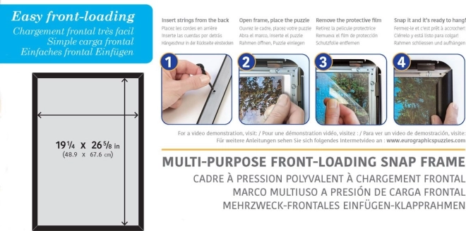 Otkrijte učinkovit način kako izložiti vaše puzle s Eurographics okvirima za zakopčavanje. Ovaj inovativni okvir dizajniran je za puzle dimenzija 48,89 x 67,63 cm, što uključuje razne vrste puzli kao Eurographics 1000 komada ili Eurographics XL 500 komada. S mogućnošću vješanja i vertikalno i horizontalno, nudi fleksibilne mogućnosti postavljanja.