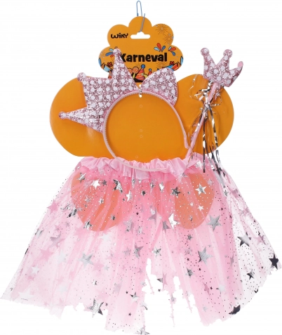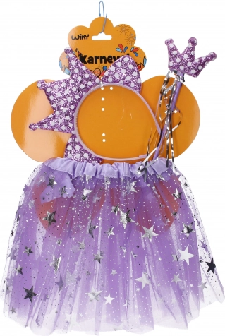 Pretvorite se u trenu u čarobnu vilu s ovim očaravajućim karnevalskim setom. U kompletu su suknja, obruč za kosu s ukrasom i čarobni štapić. Idealno za karnevale, dječje proslave i bajkovita fotografiranja.