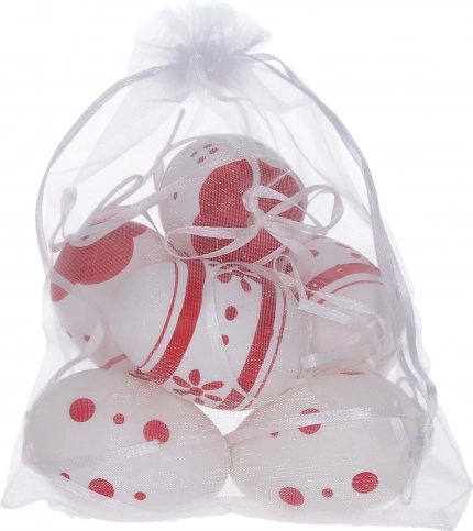 Ukrasna oslikana plastična jaja veličine 6 cm idealna su za vaše blagdanske dekoracije. Dobivate 6 komada u elegantnoj organza vrećici.