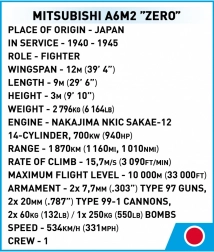 Mitsubishi A6M2 Zero lako je prepoznatljiv japanski lovački zrakoplov iz Drugog svjetskog rata, proslavljen sudjelovanjem u ključnim bitkama poput napada na Pearl Harbor i bitke za Midway. Set sadrži 170 visokokvalitetnih kockica koje vam omogućuju izradu detaljnog modela ovog legendarnog zrakoplova s odvojivim stajnim trapom.