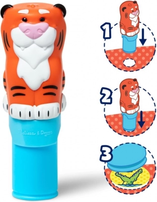 Žig u obliku razigranog tigrica omogućuje djeci stvaranje sjajnih naljepnica pritiskom na samo jedan gumb. Dovoljno je prisloniti žig na bilo koju površinu i pojavit će se šarena naljepnica s motivima džungle. Set uključuje do 300 naljepnica s motivima tigra i drugih životinja iz džungle, što čini žig odličnim izborom za djecu od 3 godine naviše.