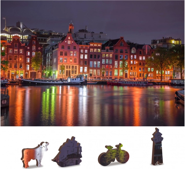 Ova jedinstvena drvena slagalica oduševit će svakog ljubitelja slaganja. Zahvaljujući laserskom rezanju nudi slagalica glatke rubove, koji se lako spajaju. Sadrži ukupno 150 dijelova, od čega 30 dijelova ima jedinstvene oblike poput životinja ili poznatih građevina, dodajući edukacijski element i istovremeno vizualnu estetiku. Slagalica je dizajnirana kao 2u1, što znači da ju možete slagati kako prema rafiniranom noćnom motivu Amsterdama, tako i prema obliku dijela uzorka na stražnjoj strani.