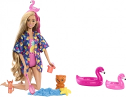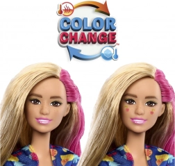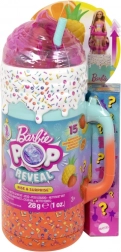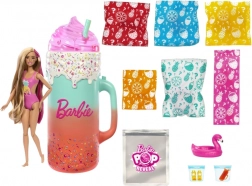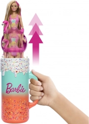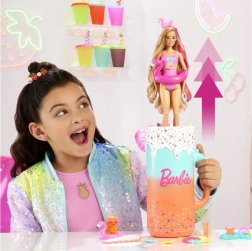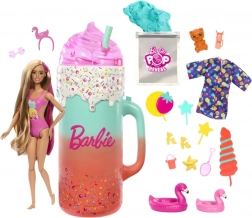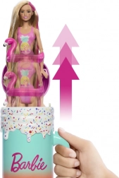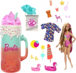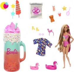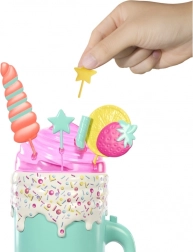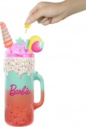 Dovoljno je podići poklopac šarenog “čašiča” i pritisnuti gumb na ručki – lutka Barbie efektno se podiže i predstava može početi. Otvarajte višekratne “kocke leda” i vrećice s iznenađenjem, otkrijte preslatkog mirisnog ljubimca, plažne dodatke i odjevne komade s tropskim motivima. Zahvaljujući promjeni boje make-upa uz hladnu i toplu vodu, osigurani su novi trenuci igre.