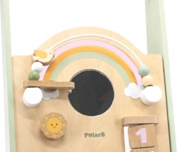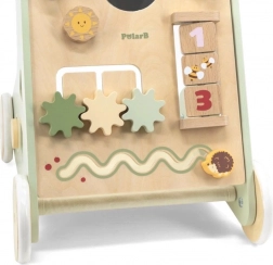 Drvena guralica-hodalica PolarB Viga osmišljena je da djecu sigurno prati kroz njihove prve korake i istovremeno ih potiče na istraživanje. Prednji panel nudi mnoštvo aktivnosti – od okretnih zupčanika preko kliznih labirinta do razvrstavanja oblika i zrcalca, koji prirodno razvijaju osjete i logičko razmišljanje.