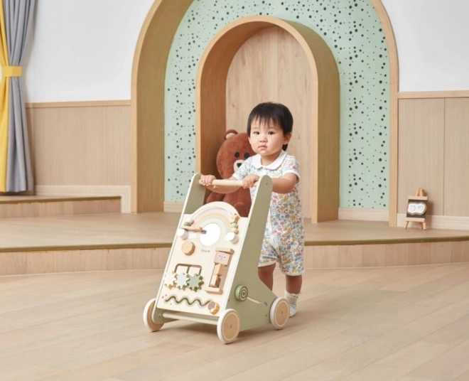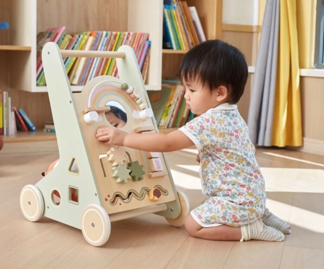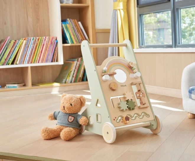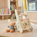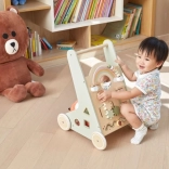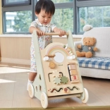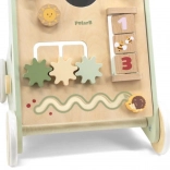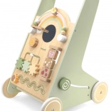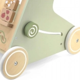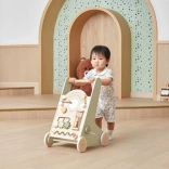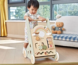 Stilna drvena hodalica za mališane iz serije PolarB brenda Viga spaja potporu pri prvim koracima i multifunkcionalni aktivni panel za igru i učenje. Sadrži zupčanike, razvrstavanje oblika, zrcalce, kuglične perlice, klizače i malu ploču. Potiče finu i grubu motoriku, koordinaciju i samopouzdanje pri hodu.