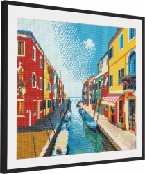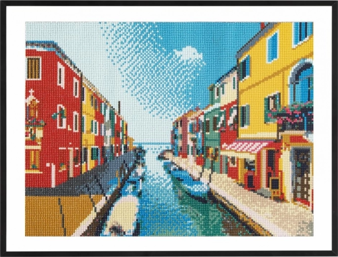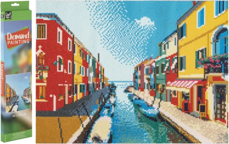 Dijamantno slikanje je kreativna zabava za svakoga – sitne, šarene kamenčiće postupno postavljate na unaprijed otisnuto platno pomoću aplikacijskog pera. Motiv romantičnog vodenog kanala istaknut će se sjajem kamenčića i pretvoriti se u originalnu dekoraciju vašeg doma.