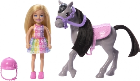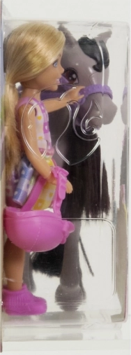 Igraći set Barbie Chelsea na poniju donosi djeci puno zabave i mašte. Chelsea stavlja sigurnosnu ružičastu kacigu, sjeda u udobno ružičasto sjedlo i zahvaljujući savitljivim koljenima i stremenima kreće u stiliziranu vožnju. Sivi poni s ljubičastom uzdicom, mekom grivom i repom savršen je za njegu i nježno maženje.
