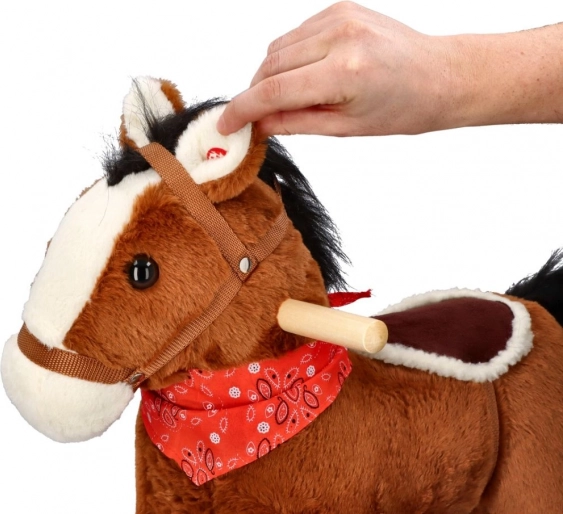 Smeđi plišani konjić za ljuljanje za djecu od 3 godine. Stabilna drvena baza, mekana površina, nosivost 50 kg, masa 3,5 kg. CE certifikacija.