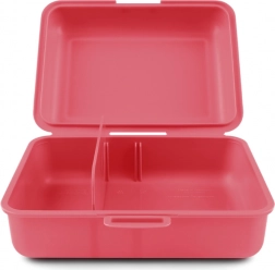 Stilsku kutiju za užinu za djecu u crvenoj/ružičastoj boji s veselim motivom duge. Nudi sigurno zatvaranje jednim zasunom, praktičnu pregradnu stijenku za odvajanje hrane i izdržljivu plastičnu izradu idealnu za školu i izlete.