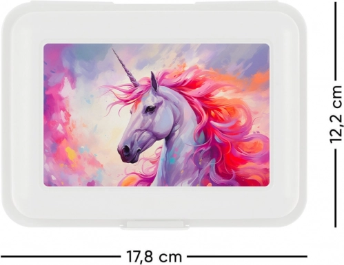 Kutija za užinu s motivom Jednorog Kraljevstvo je savršeno rješenje za pohranu i organizaciju vaše hrane. Ova bijela plastična kutija je opremljena praktičnim zatvaranjem na jedan zapon, što osigurava da sadržaj ostane sigurno unutra.