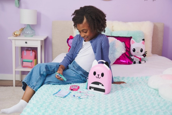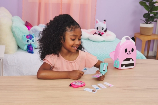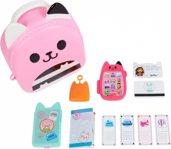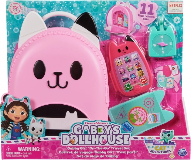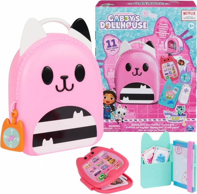 Pripremite se za uzbudljiva putovanja s putnim setom Ruksak. Ovaj set od 11 dijelova nezaobilazna je oprema za obožavatelje DreamWorks serije Gabin mačji dom koji vole igru prerušavanja. Uključuje sklopivi igrački mobitel koji može spremiti mačji privjesak za ključeve, Gabinu identifikacijsku karticu, privjesak s kompasom, putni novčanik koji prima igračku putovnicu i putne karte te super slatku kutijicu za igračke u obliku mačke sa posebnim držačima u koju stanu sve sjajne vrtićke igračke. Svaki je dio seta posebno izrađen s autentičnim dizajnom i stilom, tako da izgleda baš kao Gabina putna oprema iz serije. Djeca će obožavati trčkarati po kući i pretvarati se da putuju svijetom baš kao Gabi. Za još više uzbudljivih avantura potražite i fotoaparat koji također stane u spremnik, pa se možete zabavljati fotografiranjem tijekom putovanja (fotoaparat se prodaje zasebno). Za posljednje iznenađenje skenirajte QR kod na pakiranju putnog seta i pristupite besplatnoj aplikaciji Gabin mačji dom (dostupno za iOS i Android). Plišane igračke, lutke, figurice i setovi Gabin mačji dom idealne su igračke za djevojčice i dječake koji vole koristiti maštu i stvarati vlastiti svijet kućica za lutke, zato se pripremite za beskrajne avanture s Gabinim putnim setom.