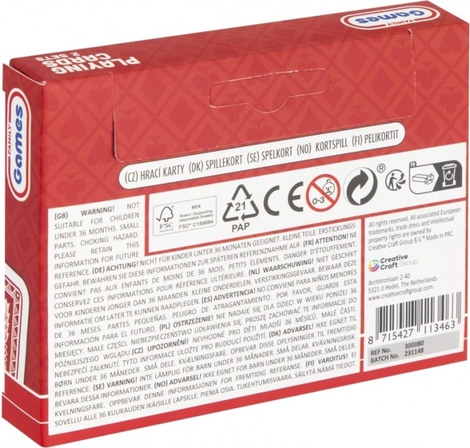 Ove igraće karte francuskog tipa savršene su za igranje kanaste, žandara, bridža, pokera ili pasijansa. Paket sadrži 2 seta od 55 karata, što omogućuje veliku fleksibilnost pri igranju. Svaka karta ima dimenzije otprilike 8,5 x 5,5 cm, što osigurava udobno rukovanje i jasnu čitljivost vrijednosti.