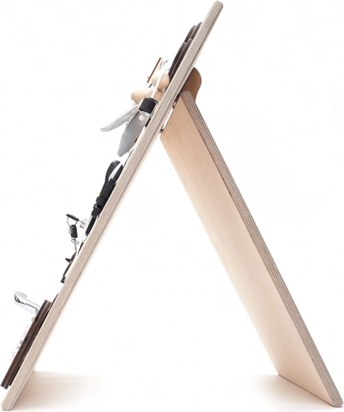 Montaža je brza i intuitivna – u pakiranju se nalazi sve potrebno. Stalak štedi prostor i osigurava pravilan kut za udobno istraživanje brava, šarki i ostalih elemenata na ploči.