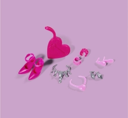 U pakiranju se nalaze 2 ogrlice, 2 para naušnica, 2 narukvice, torbica u obliku srca i cipele s potpeticom za beskrajne mogućnosti stiliziranja.