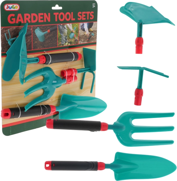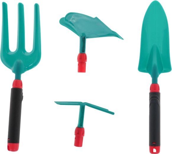 Otkrijte zabavu u vrtu s ovim sigurnim dječjim setom vrtnog alata za djecu od 3 godine. Set sadrži 4 lagana alata bez oštrih rubova i s odvojivim drškama za jednostavno skladištenje. Univerzalna tirkizno–crvena kombinacija boja prikladna je i za dječake i za djevojčice, a ergonomski oblici pristaju malim dječjim rukama.