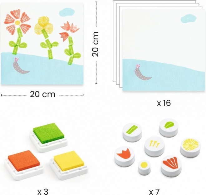 S DJECO setom za štambiljanje Cvijeće, djeca mogu okušati štambiljanje prema uputama ili prema vlastitoj mašti. Svaki set sadrži različite prirodne i cvjetne motive koji inspiriraju za kreativnost.