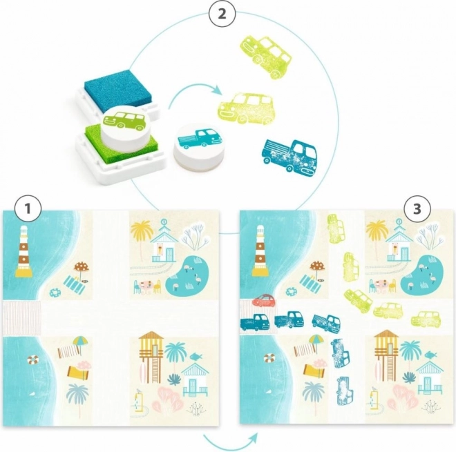 Set pečata s motivima autića, koji djeci omogućuje stvaranje šarmantnih slika i razvijanje njihove kreativnosti.