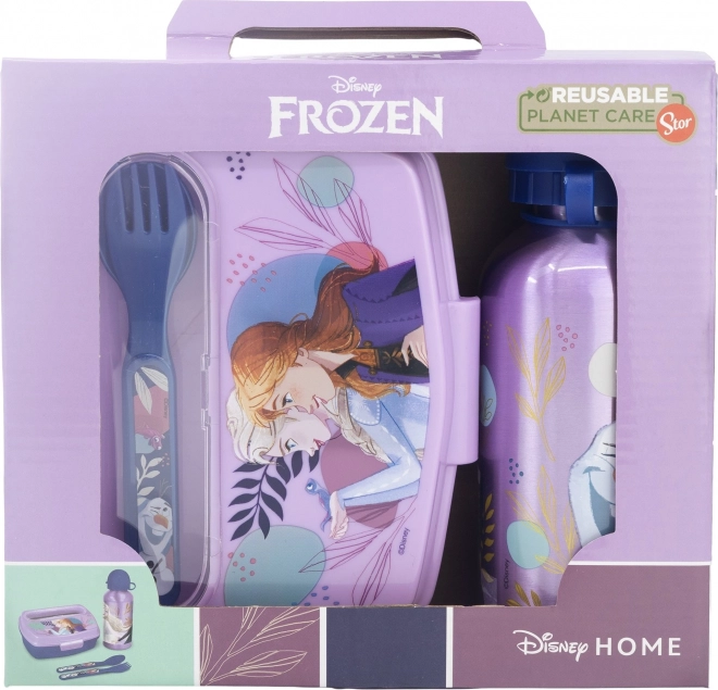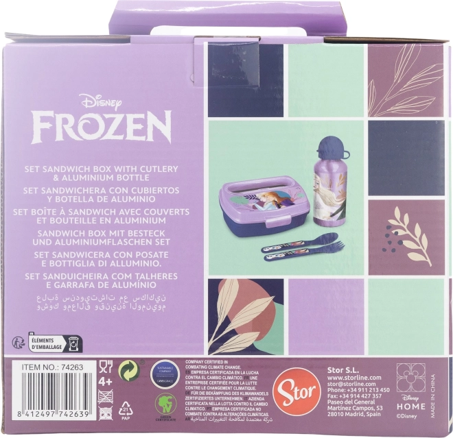 Četverodijelni dječji set za jelo s motivom FROZEN od STOR: sadrži aluminijsku bocu 400 ml, kutiju za užinu i set pribora za jelo (žličicu i vilicu). Idealan za školu i izlete, bez BPA.