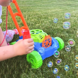 Ova šarena WOOPIE kosilica s mjehurićima pretvara svako popodne u vrtu u zabavu. Zahvaljujući automatskom puhanju mjehurića i realističnom zveckanju kotačića djeca lako oponašaju rad odraslih, dok vježbaju ravnotežu i koordinaciju. Stabilna ručka olakšava jednostavno guranje i upravljanje.