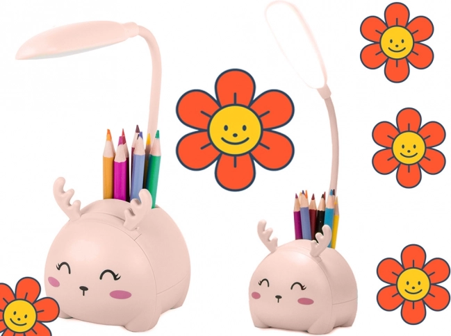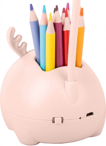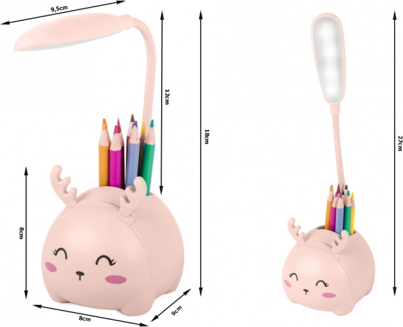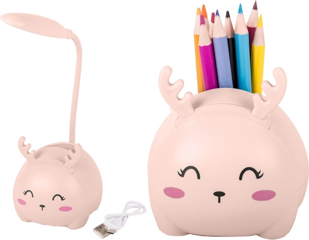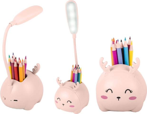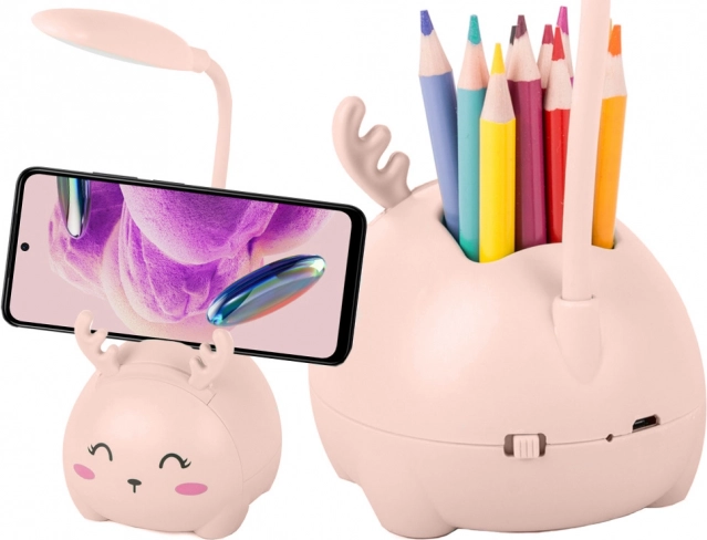 Preslatka dječja stolna lampica u obliku životinjice spaja noćno LED osvjetljenje s praktičnim organizatorom za olovke i stalkom za telefon. Zahvaljujući fleksibilnoj ruci lako usmjerite svjetlo za učenje, čitanje i igru, a USB punjenje osigurava udoban rad bez baterija.