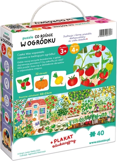Slagalica Što raste u vrtu jedinstven je edukativni set za male istraživače predškolske dobi. Sastoji se od velike slagalice s 40 dijelova i 32 precizne kartice, dodatno sadrži edukativni plakat i omogućuje mnogo načina kreativne igre. Obratite posebnu pozornost na to što raste na gredicama, grmovima i stablima u vrtu!