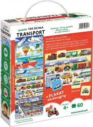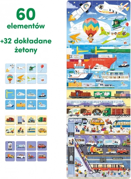 Velika šarena slagalica ima 60 dijelova i prikazuje najrazličitija prijevozna sredstva koja prevoze putnike i robu. Prepoznaješ li ih sva? Na plakatu priloženom uz slagalicu naći ćeš mnogo zanimljivosti o prometu, a 32 sličice s elementima za traženje na ilustraciji omogućuju još više kreativne zabave. Set je idealna edukativna ideja za dar znatiželjnom predškolcu, osobito ljubiteljima motorizacije.
