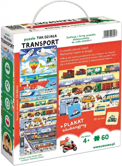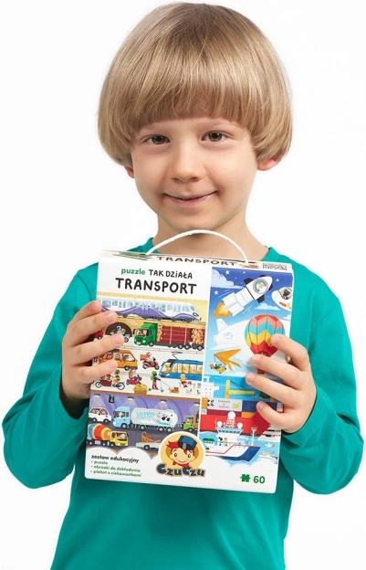 Slagalica Ovako funkcionira promet jedinstven je edukativni set za predškolsku djecu, posebno ako vole različita vozila. Sastoji se od slagalice od 60 dijelova, 32 odgovarajuće sličice i edukativnog plakata. Idemo se zabaviti! Obrati pažnju na ono što vozi cestama, plovi vodom i leti zrakom. Poznata i omiljena, kao i manje uočljiva prijevozna sredstva sjajna su motivacija za igru. Slažući slagalicu djeca na zabavan način razvijaju opažanje, strpljenje i stječu nova znanja. Zabavite se!