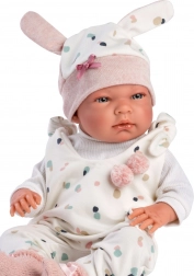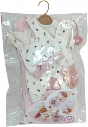 Nježne boje i točkice s usklađenom kapicom i papučicama stvaraju skladan outfit za lutku NEW BORN veličine 40–42 cm.