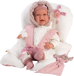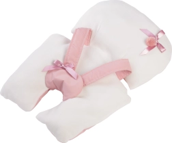 Mekana podloga s dekorativnom mašnom i sigurnosnim remenima služi kao praktična stolica za stabilno smještanje lutke.