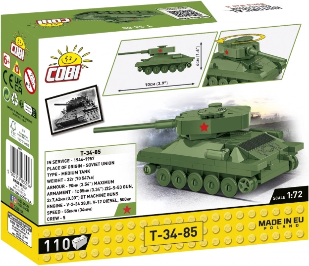 Model T-34-85 ubraja se među najpoznatije tenkove Drugog svjetskog rata, a u ovom COBI setu sastavit ćete ga kao vjernu repliku. Kvalitetna plastika, precizni odljevci i promišljena konstrukcija osiguravaju lako sastavljanje i izdržljivost pri igri. Set je idealan za djecu od 6 godina, ali razveselit će i kolekcionare te ljubitelje vojne povijesti.