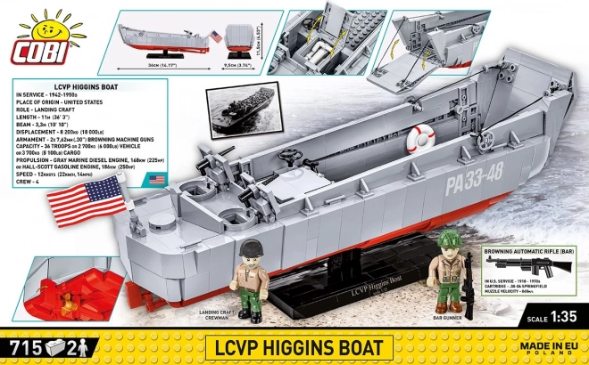 LCVP (Landing Craft, Vehicle, Personnel) konstruktora Andrewa Higginsa masovno se koristila u operacijama D-Day, Torch, Husky, Shingle i Avalanche, kao i u borbama na Pacifiku. COBI set u potpunosti je kompatibilan s drugim markama građevnih setova, udovoljava sigurnosnim standardima i dolazi s jasnim uputama.