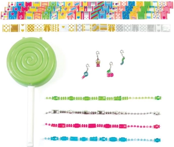 - Spremnik u obliku lizalice, 4 narukvice s perlicama, 4 privjeska, 84 komada skupljajuće folije, upute