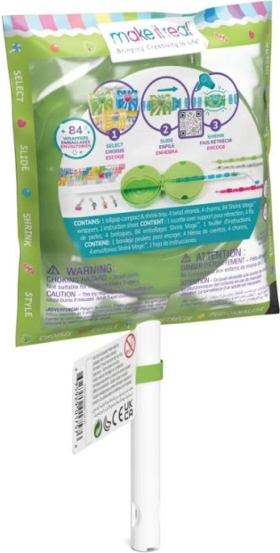 - Sve u jednom – spremnik u obliku lizalice, narukvice, privjesci, 84 komada skupljajućih folija i upute.