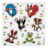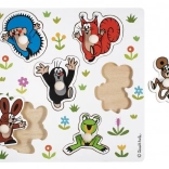 Ove drvene umetaljke puzzle s motivom KRTIĆA donose djeci zabavnu i edukativnu igru. Svaki lik ima vlastiti gumbić–hvatište, zahvaljujući kojem se dijelovi lako podižu, premještaju i umeću u obrise na ploči. Djeca tako prirodno vježbaju preciznost pokreta i strpljenje.