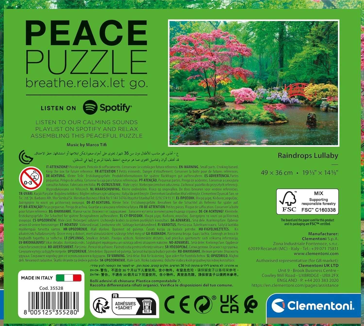 Otkrijte umirujuće slaganje s puzzleom od 500 dijelova iz linije Peace Collection. Premium izrada, čvrsta kartonska podloga, precizni izrezi i vrhunski tisak osiguravaju glatko slaganje i prekrasan rezultat. U paketu je i plakat s predložkom, savjeti za relaksaciju i mir uma te poveznica na Spotify playlistu s opuštajućom glazbom.