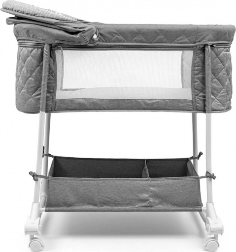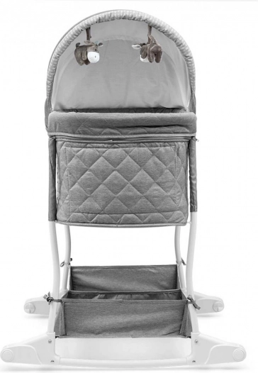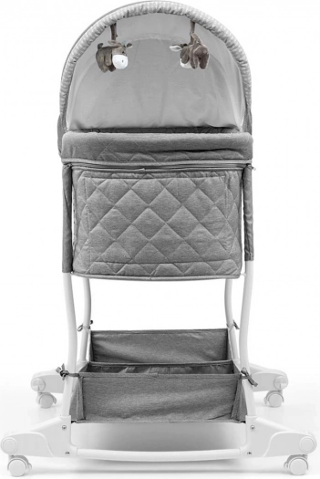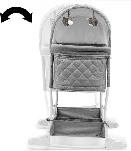 Košarica je opremljena praktičnom donjom košarom za pohranu s dvije komore za potrebe djeteta. Njezino intuitivno rukovanje omogućuje glatke prijelaze između funkcija košarice i krevetića. Navlake za kabinu i korpu su uklonjive za nježno pranje, a mekani madrac osigurava maksimalnu udobnost spavanja.