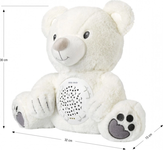 Plišana igračka s projektorom Milly savršeni je pomoćnik za roditelje pri smirivanju i uspavljivanju bebe. Kada se projektor pokrene, nasumično se bira jedna od 10 uspavanki dok se prikazuje noćno nebo.