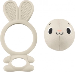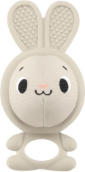 Silikonski zečić s teksturiranim uškama i otvorom za siguran hvat bebe. Odvojiva zvoneća kuglica motivira na pokret i razvija finu motoriku.