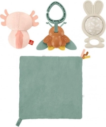 - 4 igračke: silikonska grickalica u obliku zeca (bez BPA) s odvojivom zvonećom kuglicom, plišani aksolotl sa zvoncem, taktilna zvečkica‑leptir s kopčom, meki šuškavi panel s vrpcom