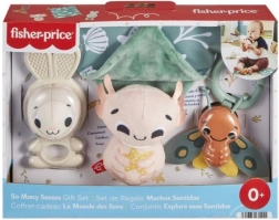 Poklon set FISHER‑PRICE Svijet osjeta promišljen je odabir prvih igračaka za bebe koje potiču istraživanje kontrastima, raznim teksturama i nježnim zvukovima. Svaki je komad dizajniran za siguran hvat, umirenje kod nicanja zubića i podršku ranom senzorničkom razvoju.