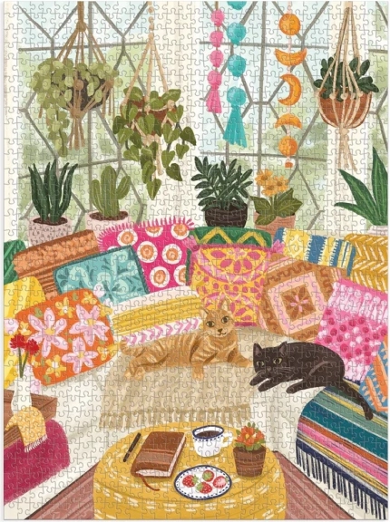 Elegantne puzzle s motivom dviju mačaka u raju ručno rađenih tekstila i sobnih biljaka odličan su izbor za mirne trenutke ili kao originalan poklon. Zahvaljujući vrhunskom tisku netoksičnim bojama i mat završnoj obradi ističu se detalji i vjernost boja.