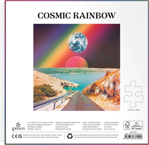 Uronite u svijet boja i mašte sa slagalicom GALISON Cosmic Rainbow od 500 dijelova. Nadrealni krajolik s dugom, planetima i obalnom stazom stvara umjetnički izražajnu scenu koja će razveseliti i početnike i iskusne slagatelje. Zahvaljujući kvalitetnom tisku i čvrstim dijelovima, slaganje je glatko i zadovoljstvo.