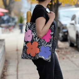 Ova torba prikazuje slavni tiskani uzorak cvijeća od Andyja Warhola, što joj daje umjetnički dojam.
