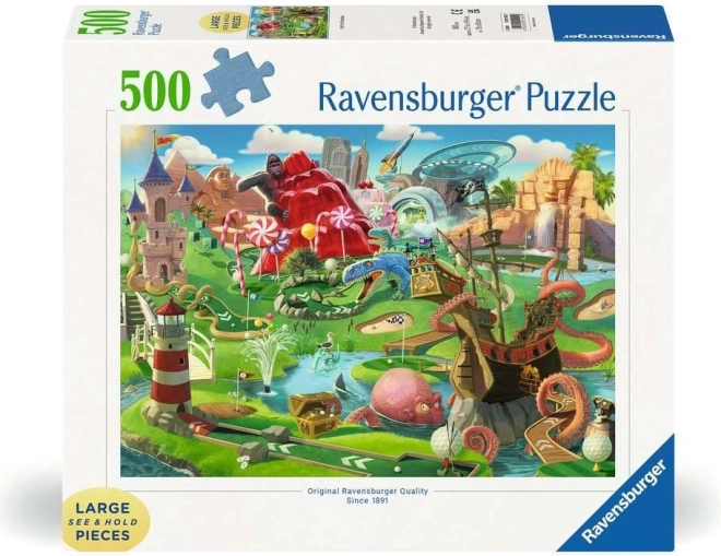 Otkrijte radost slaganja s puzzlama RAVENSBURGER s motivom minigolfski raj. Dijelovi su ekstra veliki za lakše rukovanje, idealni za djecu, seniore i osobe sa slabijim vidom. S otprilike 500 XXL dijelova veličine oko 3 cm trenirate finu motoriku i strpljenje, a gotova slika mjeri približno 70 × 50 cm.