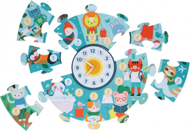 U središtu slagalice nalazi se veliki brojčanik s podesivim kazaljkama. Djeca tako na zabavan način vježbaju određivanje sati i minuta te povezuju igru s praktičnim učenjem.