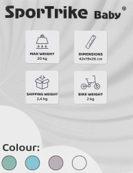 Guralo SporTrike PettyTrike idealno je prvo “bicikl” za djecu otprilike od 1 do 3 godine. Zahvaljujući četiri kotača i niskoj građi pruža izvrsnu stabilnost, pa se djeca mogu usredotočiti na razvoj ravnoteže i motorike bez straha od pada. Lagana konstrukcija olakšava upravljanje i nošenje roditeljima.
