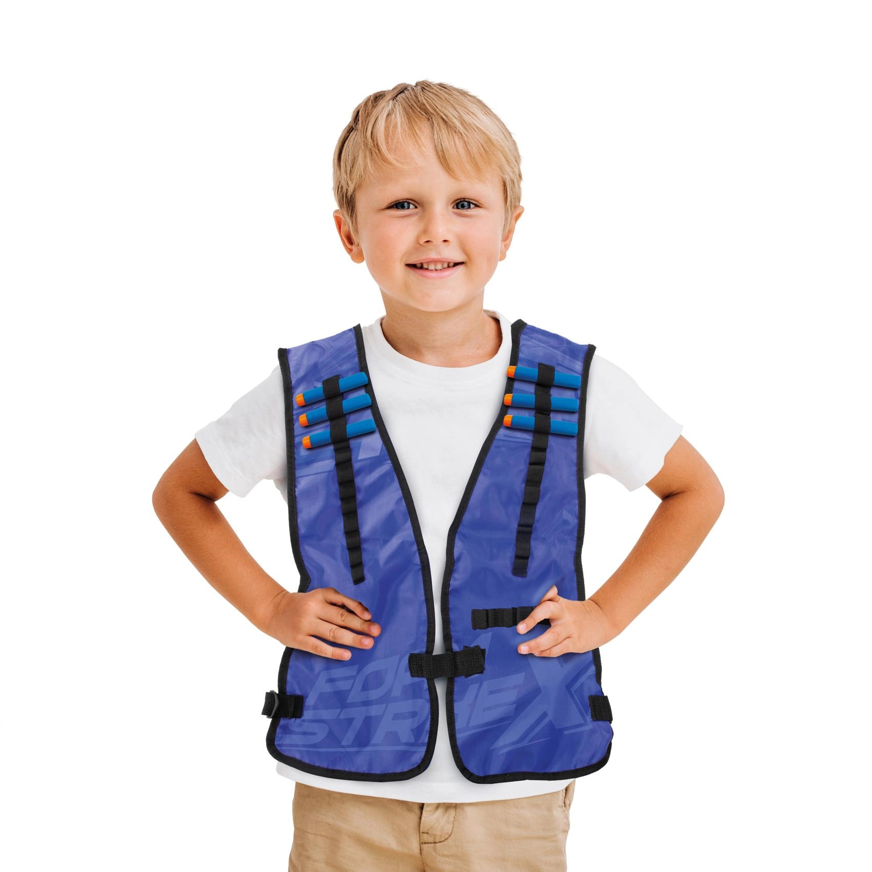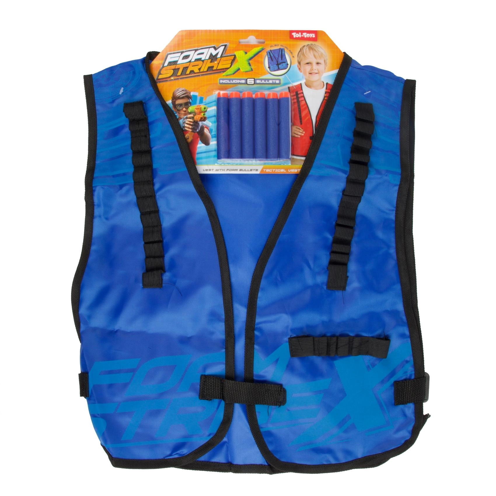 Praktične dimenzije 38 × 44 cm odgovaraju djeci od 3 godine. Podesive naramenice i prednje kopčanje osiguravaju stabilno i sigurno pričvršćivanje preko majice ili hoodice. U pakiranju je 6 kom rezervnih pjenastih metaka, pa igra može početi odmah.